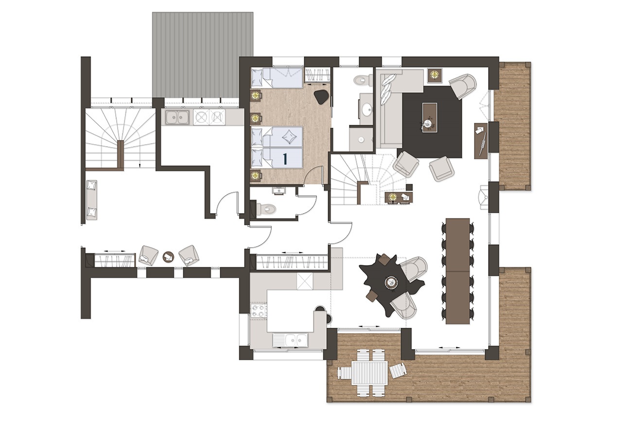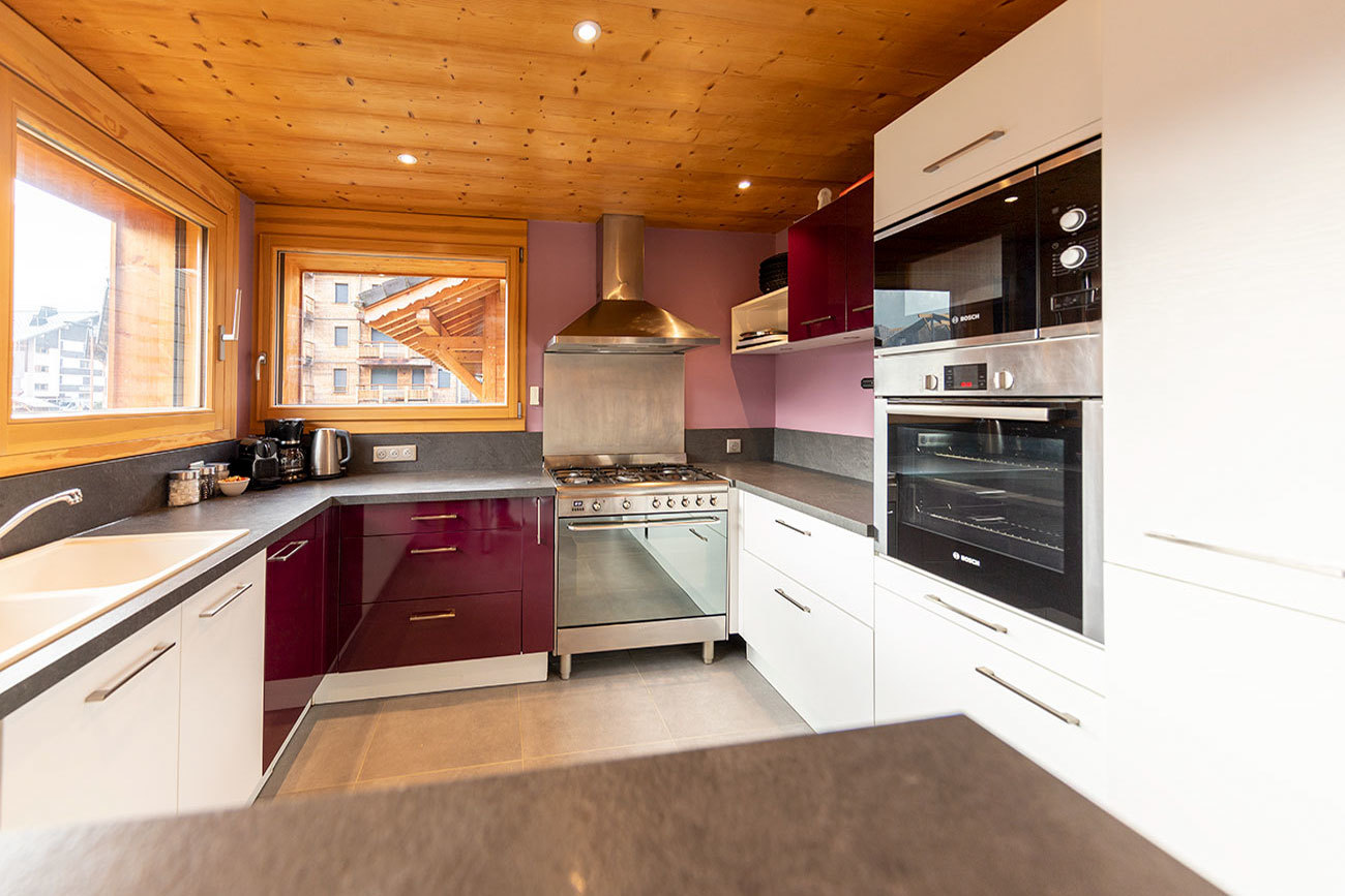 And, the living area is tailor-made for making the sort of memories that last a lifetime. Huge windows on three sides mean the main room is full of light, while a wood-burning stove in the centre keeps things cosy. You can just imagine collapsing on the sofa after a day on the mountain, and just relaxing with a glass of something chilled and white (or warm and red if you prefer) — or even taking your glass onto the wraparound balcony and watching as the light fades behind the mountains.