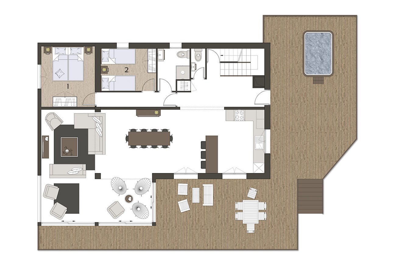 Wonderful stay at Chalet Bech'na! We were welcomed with a smile when we arrived after a long day! Loved our stay with five couples and our small children. There was loads of space for all of us and we never felt in each other's way. There were great little play areas for the kids. We were so comfortable and relaxed during our stay. Hated to leave! The hot tub was amazing! The terrace is on the sunny side and you have a great new of the mountains. This was a great quiet Chalet located a bit outside of town for a relaxing mountain holiday. Not action packed but perfect for us with the small children. (Bring a pram! We forgot and it was a bit of a hassle on the buses as they are quite packed)