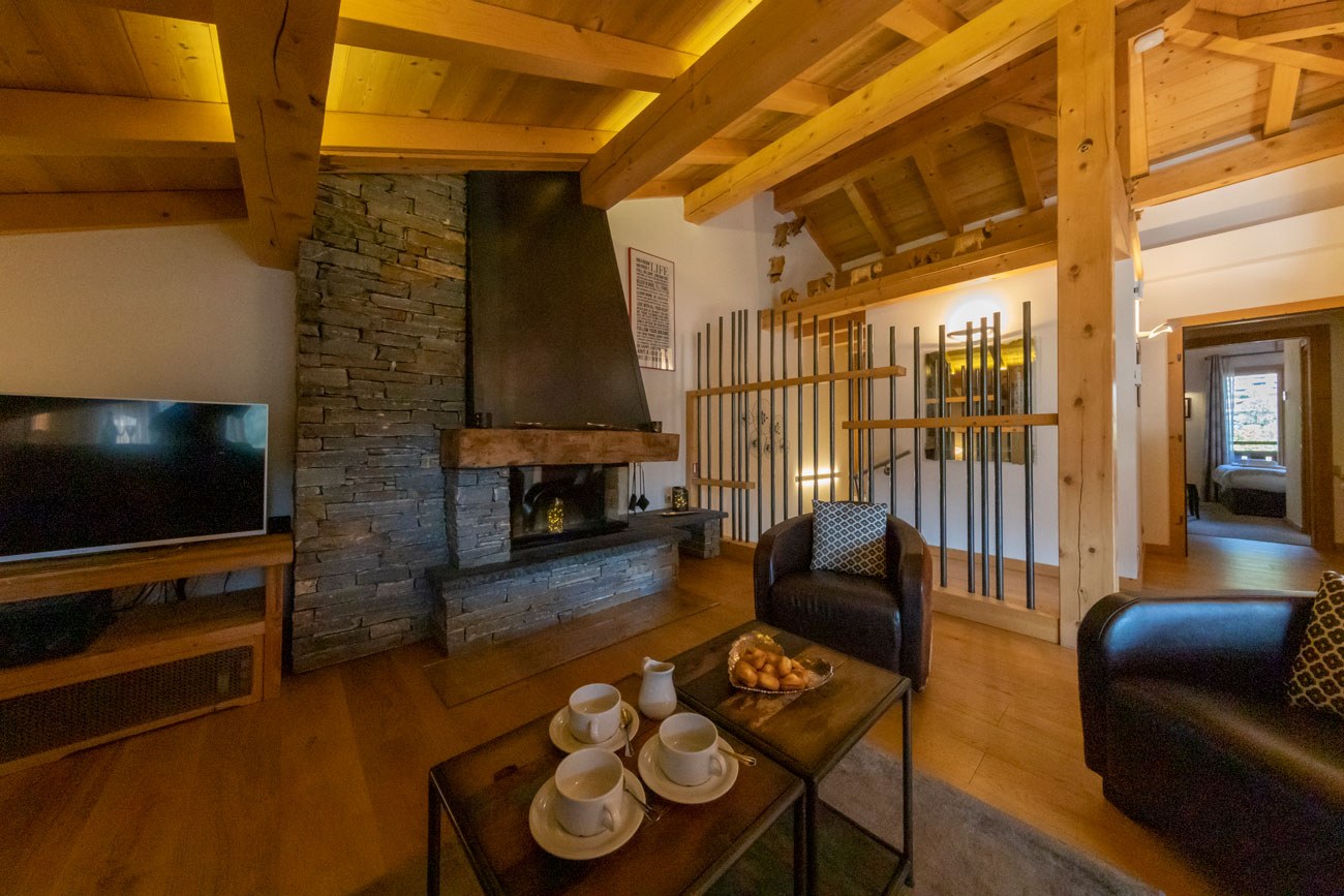 Appartement La Réserve 3 offre également un joli coin salon équipé de canapés et fauteuils confortables, TV HD, lecteur DVD/Blu-ray et enceinte Bluetooth, idéal pour se divertir après une journée en montagne et se détendre devant un bon feu de cheminée.