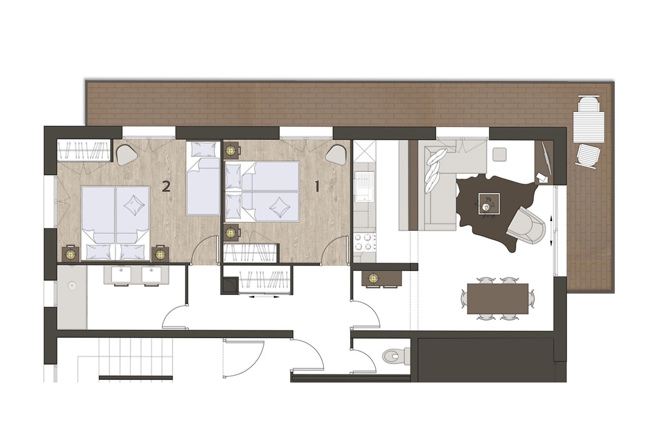 L’appartement Rhodos peut être combiner avec l’appartement Gentianes situé sur le même pallier avec un sas d’entrée commun, ou même l’appartement Edelweiss (à l’étage supérieur) idéal pour les groupes qui souhaitent un peu plus d’espace.