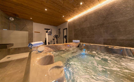 Chalet Téléphérique's hot tub is a little different to our other chalets. It is situated in a wellness room which also features a fitness area to help dispel any mountain aches and pains.